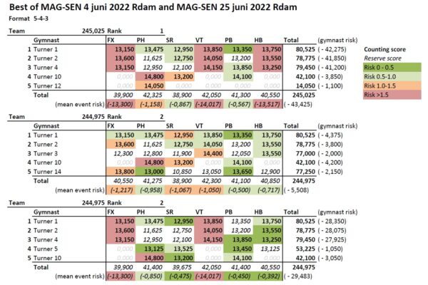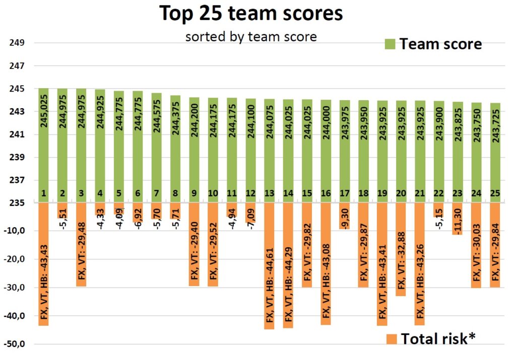 Voorbeeld van de totale teamscores van de beste 25 teams (aflopend), berekend op basis van de selectiewedstrijden. In het oranje (negatief) is het totale teamrisico weergegeven en de toestellen waarop geen reservescore in het team aanwezig is.