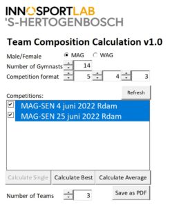 Voormalig bondscoach van de Nederlandse mannen Mitch Fenner vroeg zich in aanloop naar de Olympische Spelen van 2016 in Rio de Janeiro af of de Embedded Scientist van de KNGU/InnoSportLab een rekenprogramma zou kunnen maken dat voor hem op basis van een aantal selectiewedstrijden de teamsamenstellingen kon uitrekenen die tot het hoogste teamtotaal scores leiden. Met deze vraag ontstond de eerste versie van een ‘rekenhulpje’ dat alle mogelijke teamsamenstellingen berekende, met bijbehorende teamscores.